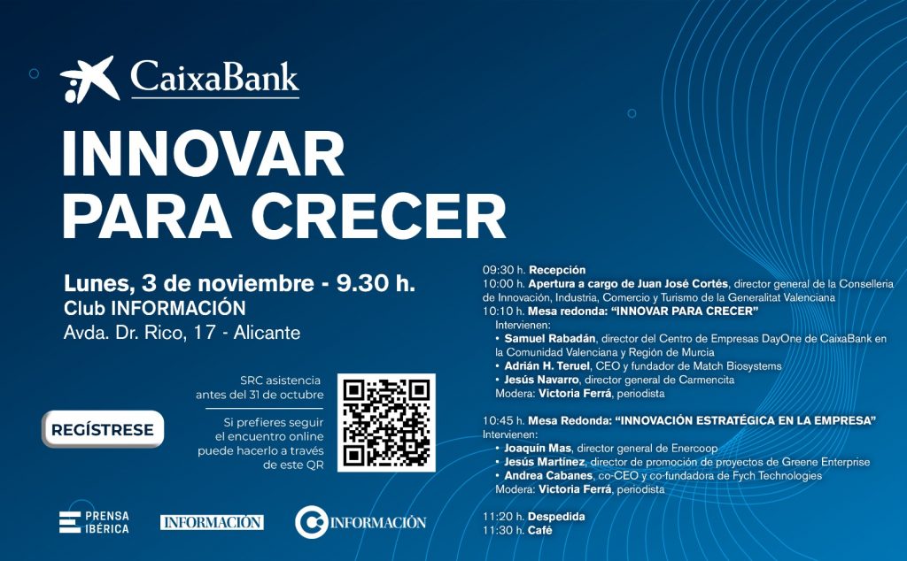 Jornada CAIXABANK: INNOVAR PARA CRECER PROGRAMA 09:30…Mari Luz Gil3 octubre, 2025 - 09:30 Club INFORMACIÓN. Avenida Doctor Rico, 17 - Alicante