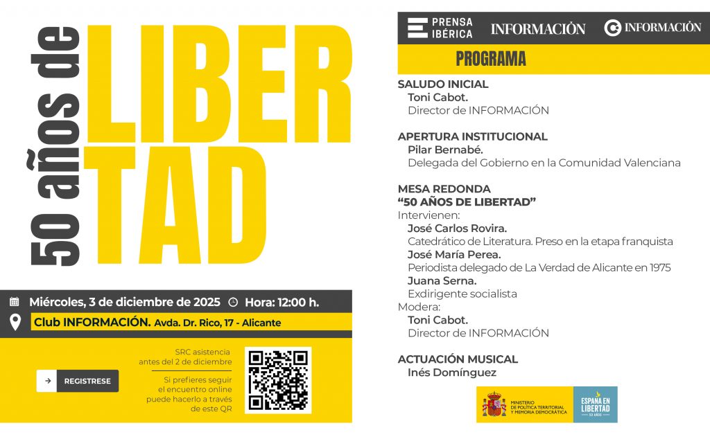 Jornada 50 AÑOS DE LIBERTAD Saludo inicial:…Mari Luz Gil3 diciembre, 2025 - 12:00 Club INFORMACIÓN. Avenida Doctor Rico, 17 - Alicante